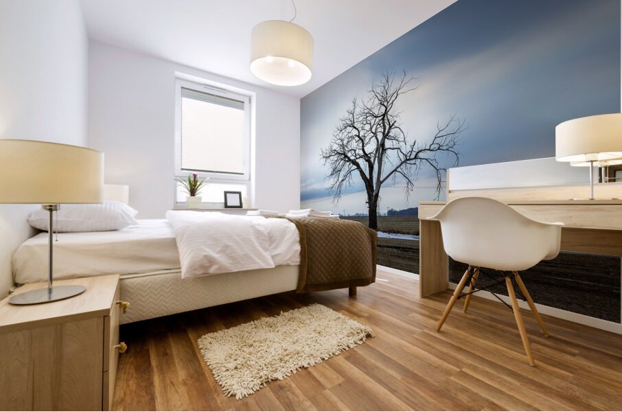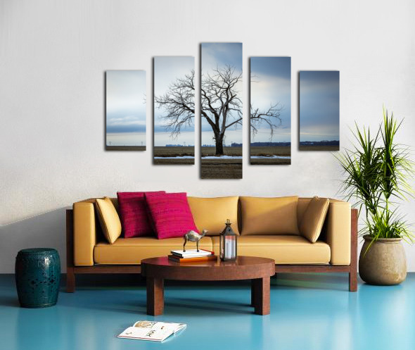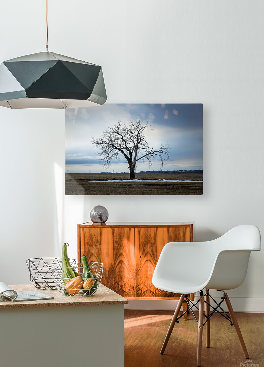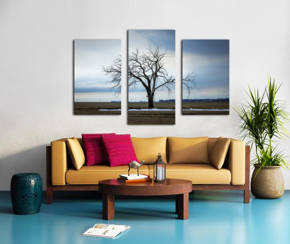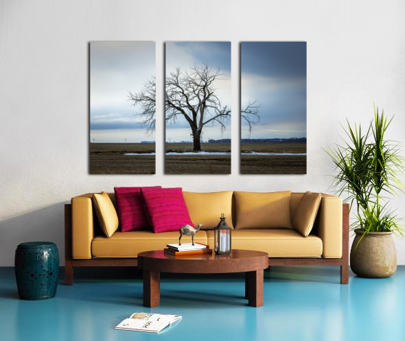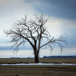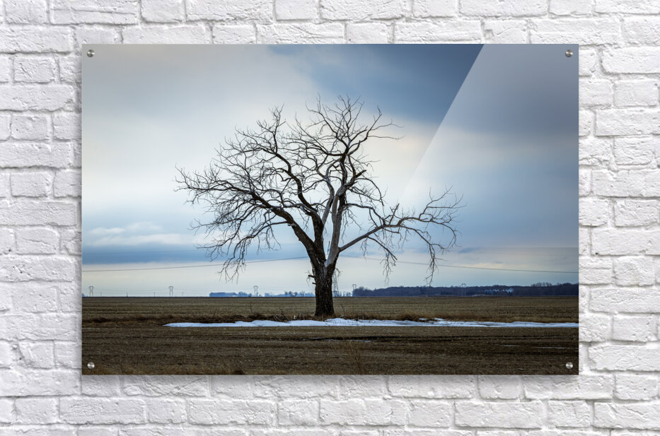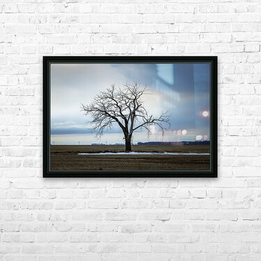 Letellier, Manitoba, Canada, March 2025 A solitary tree stands resolute against a moody winter sky, its bare branches reaching out like fingers against the vast expanse of a rural landscape. The subtle contrast between the starkness of the tree and the soft hues of the clouds evokes a sense of quiet contemplation. Patches of lingering snow hint at the season's chill, while the open fields stretch endlessly, inviting reflection. This artwork embodies the beauty of solitude and the serene power of nature, making it a striking addition to any space.