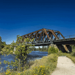 This striking image presents a weathered bridge arching gracefully over a tranquil waterway, framed by lush greenery and a clear blue sky. The path le...[+]