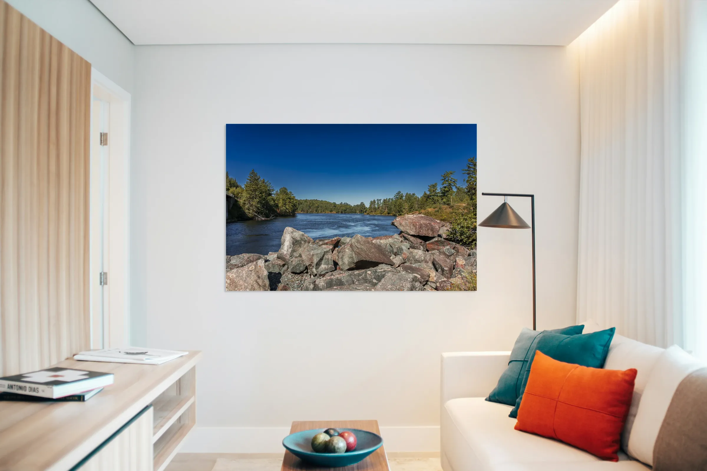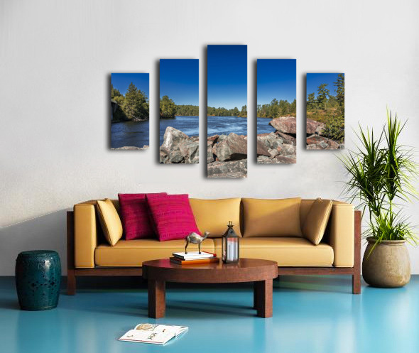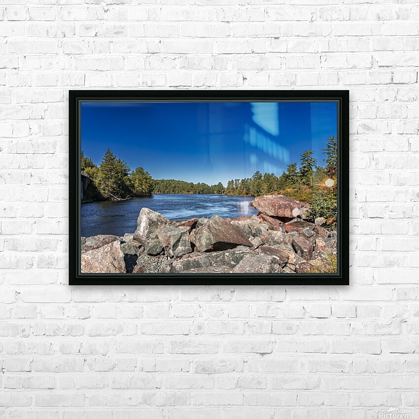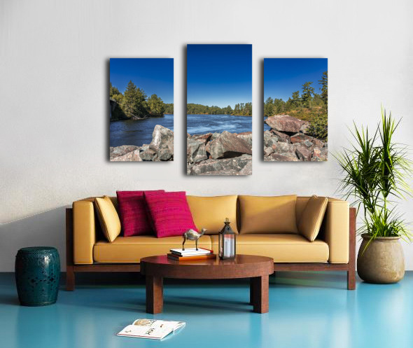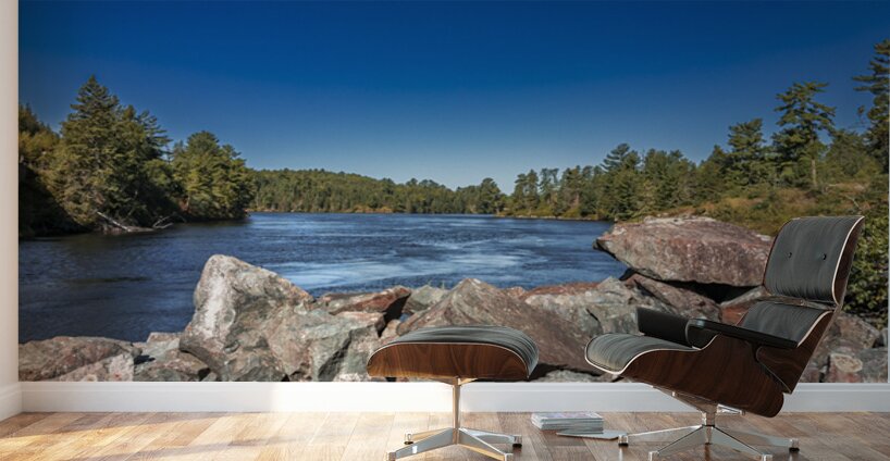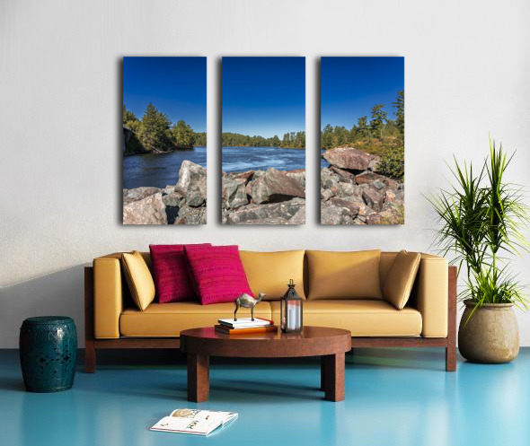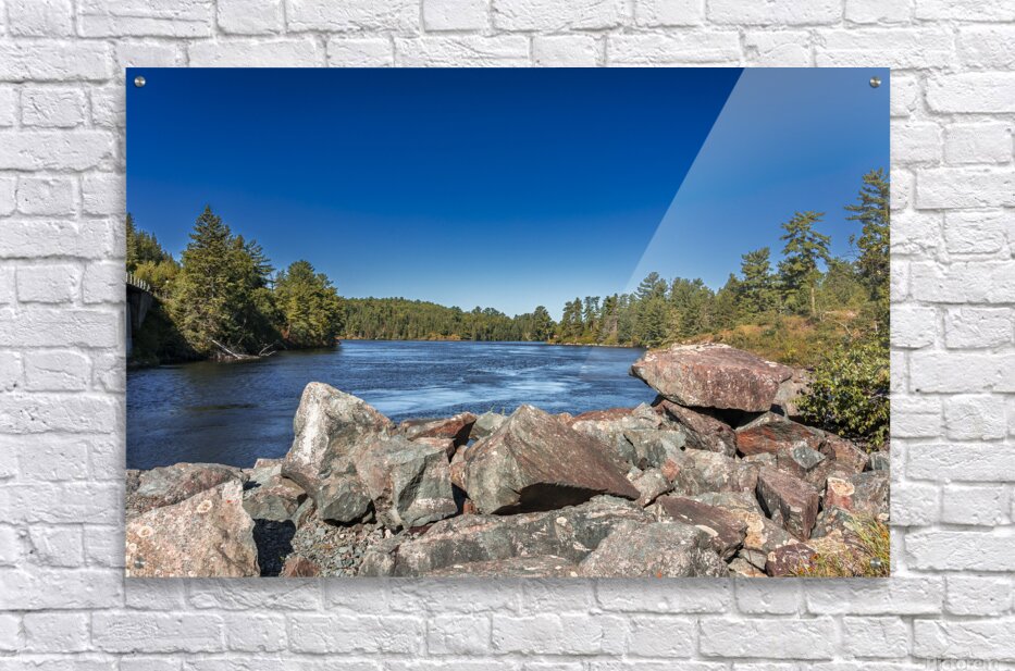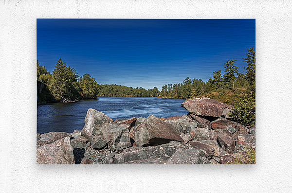 This striking scene captures the tranquil flow of a river bordered by rugged rocks and lush trees, set against a clear blue sky. The interplay of light and shadow on the water's surface reveals the subtle beauty of nature, inviting a moment of reflection. Captured in the Tunnel Island Trail nestled within the city of Kenora, this piece embodies the diverse landscapes of Northwest Ontario. The vibrant colors and textures evoke a sense of peace, making it a perfect addition to any space that seeks to celebrate the natural world. Explore the beauty of the outdoors through this artwork, now available as a limited edition print.