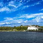 This striking image presents a serene view of Kenora's Harbour, where the tranquil waters reflect a vibrant sky adorned with fluffy clouds. The ar...[+]