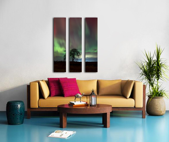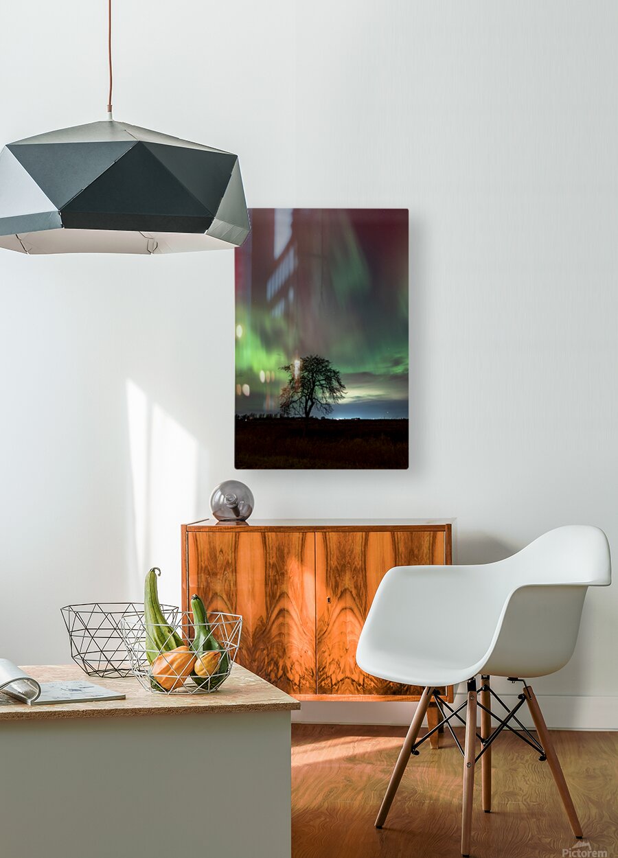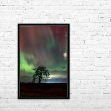 This striking artwork reveals the ethereal beauty of the Northern Lights illuminating the Manitoba sky above a solitary tree, captured near St-Pierre ...[+]