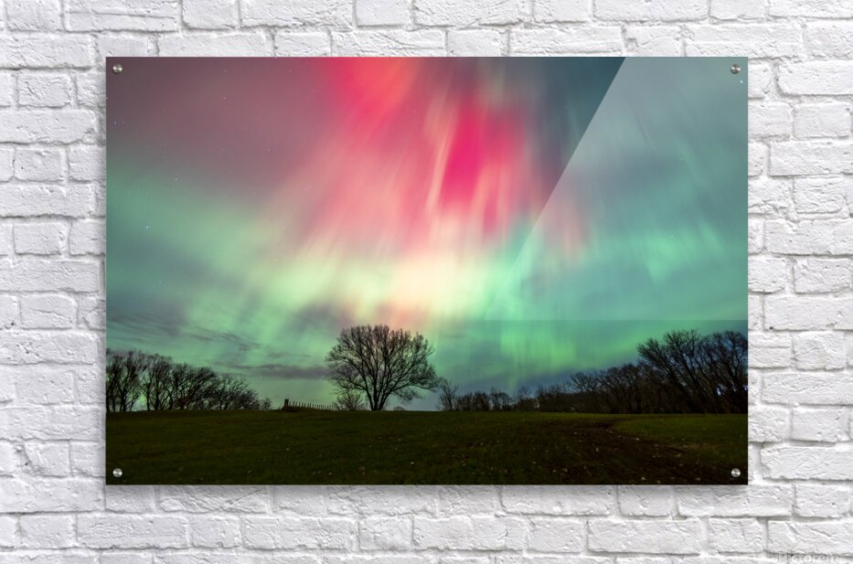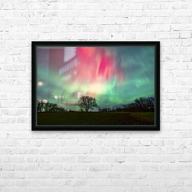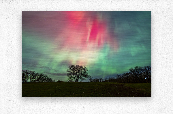"Aurora Colorscape" presents a breathtaking display of the Northern Lights, where vibrant hues of green and pink dance across the night sky. Captured in Manitoba, this artwork reveals the serene beauty of nature's light show, framed by silhouetted trees that ground the ethereal scene. Each glance invites reflection on the quiet majesty of our rural landscapes. This piece would make a striking addition to any space, bringing a touch of the Canadian wilderness indoors. Captured in St-Malo Provincial Park on Remembrance Day 2025
