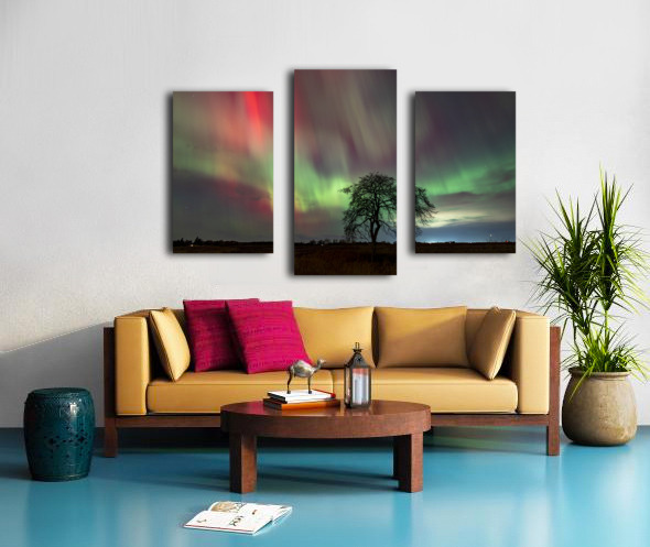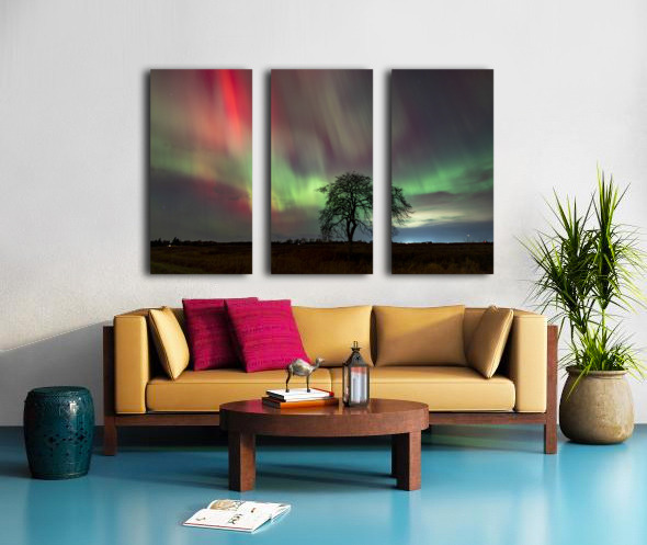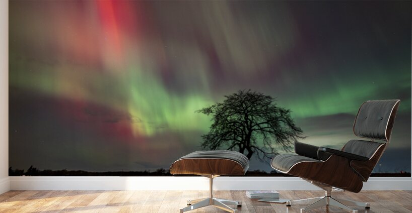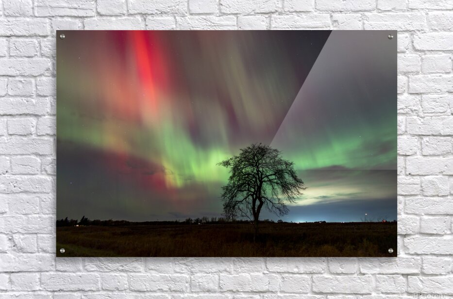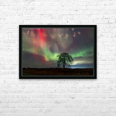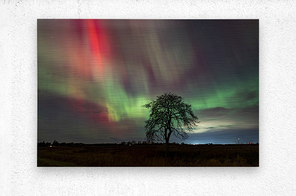 "**Northern Lights Dance** captures the mesmerizing interplay of colors in the night sky, showcasing the vibrant auroras that grace Manitoba's landscape. A solitary tree stands in silhouette, grounding the ethereal display above. This piece invites viewers to reflect on the beauty of nature's phenomena and the quiet moments that inspire awe. Perfect for adding a touch of serenity to your space, this artwork embodies the magic of the Canadian wilderness." Captured in St-Pierre Jolys on Remembrance Day 2025
