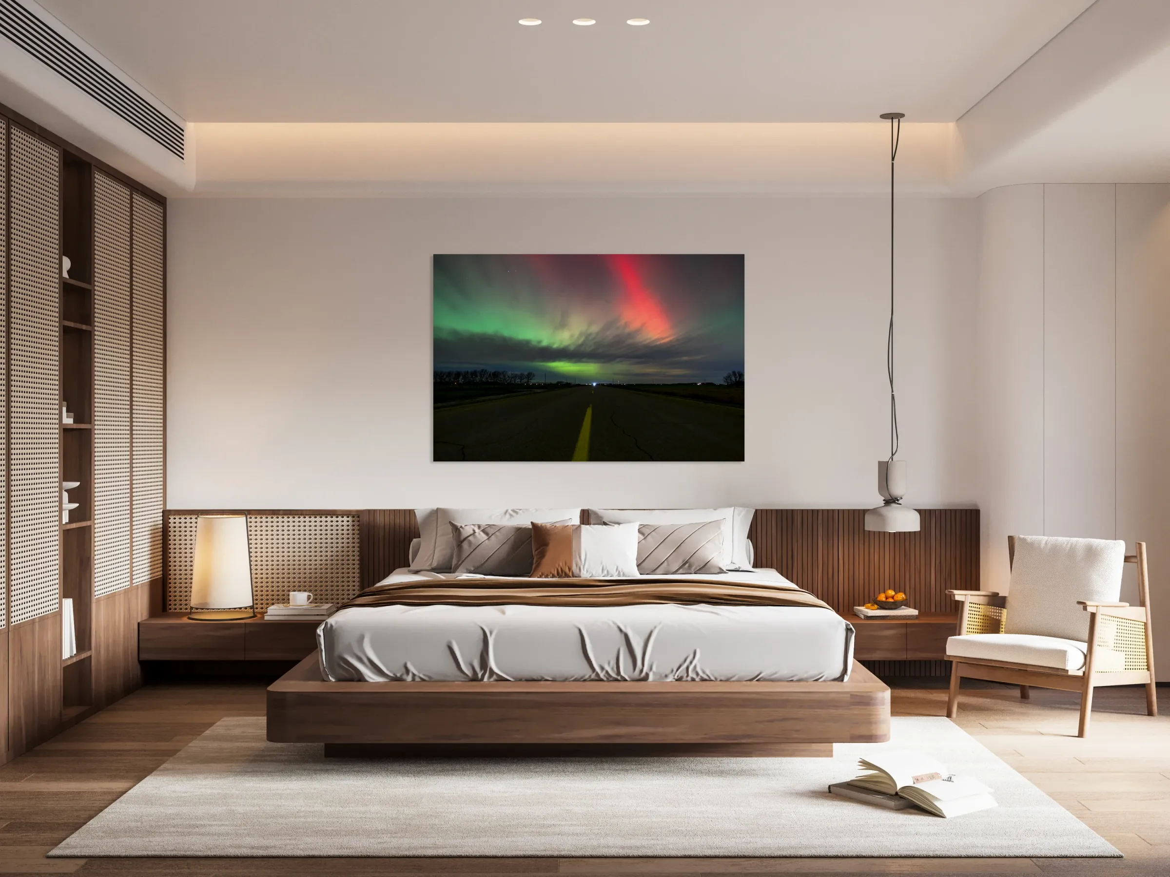 This striking image captures the mesmerizing dance of the Northern Lights over a quiet Manitoba road. The vibrant hues of green and red illuminate the sky, creating a breathtaking contrast against the darkened landscape. The scene invites reflection on the beauty of our natural world, reminding us of the serene moments that can be found in rural life. A perfect addition to any space, this print brings a touch of the Canadian wilderness into your home. Captured near Ste-Agate on Remembrance Day 2025