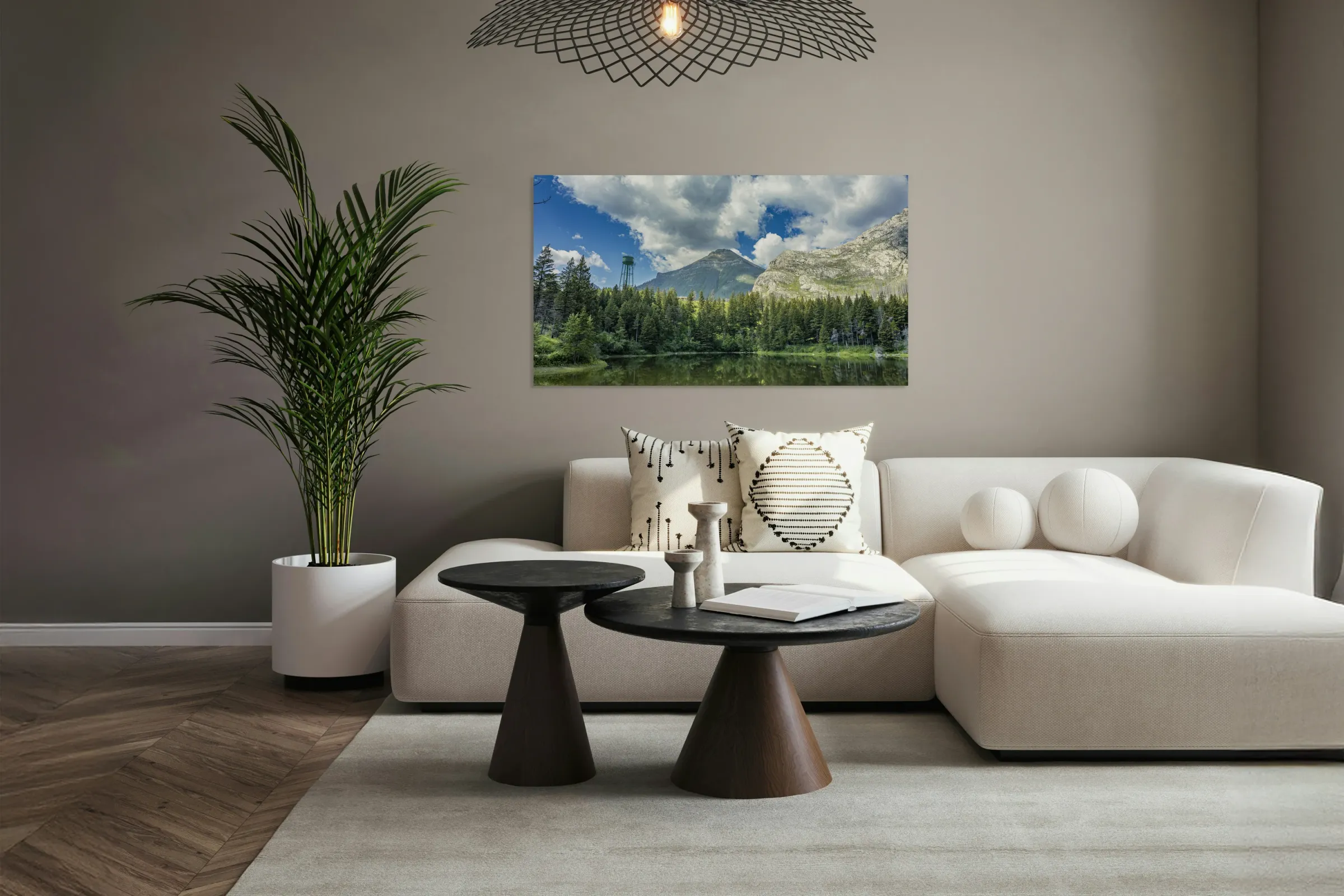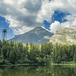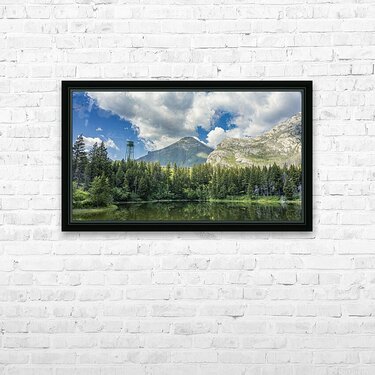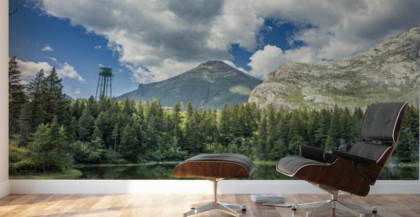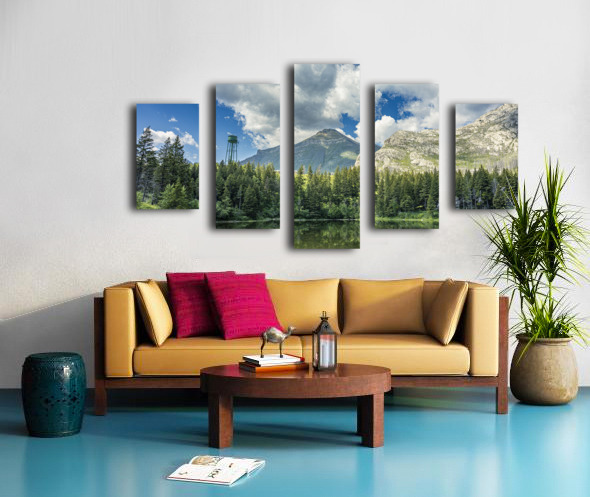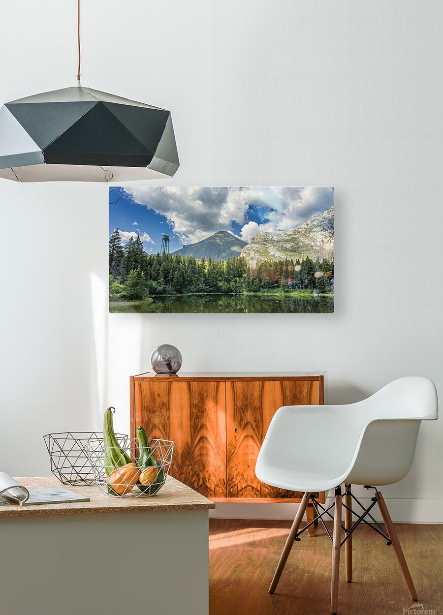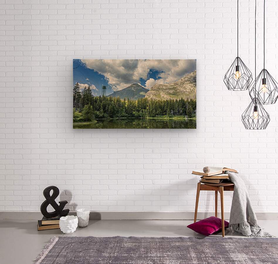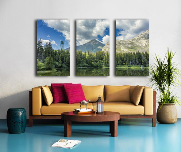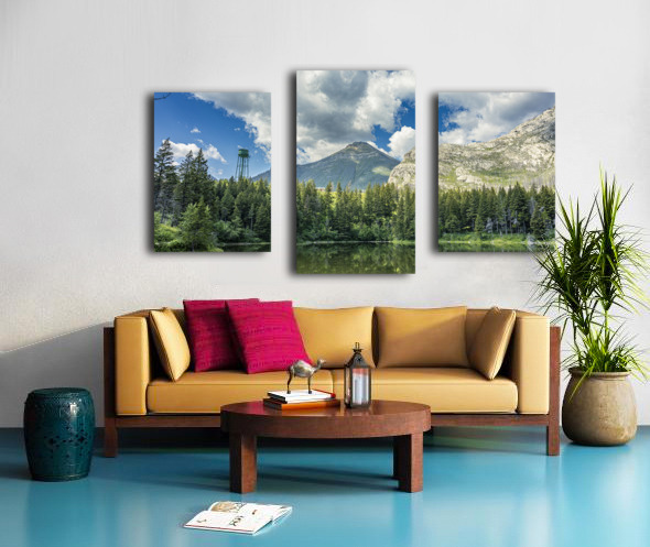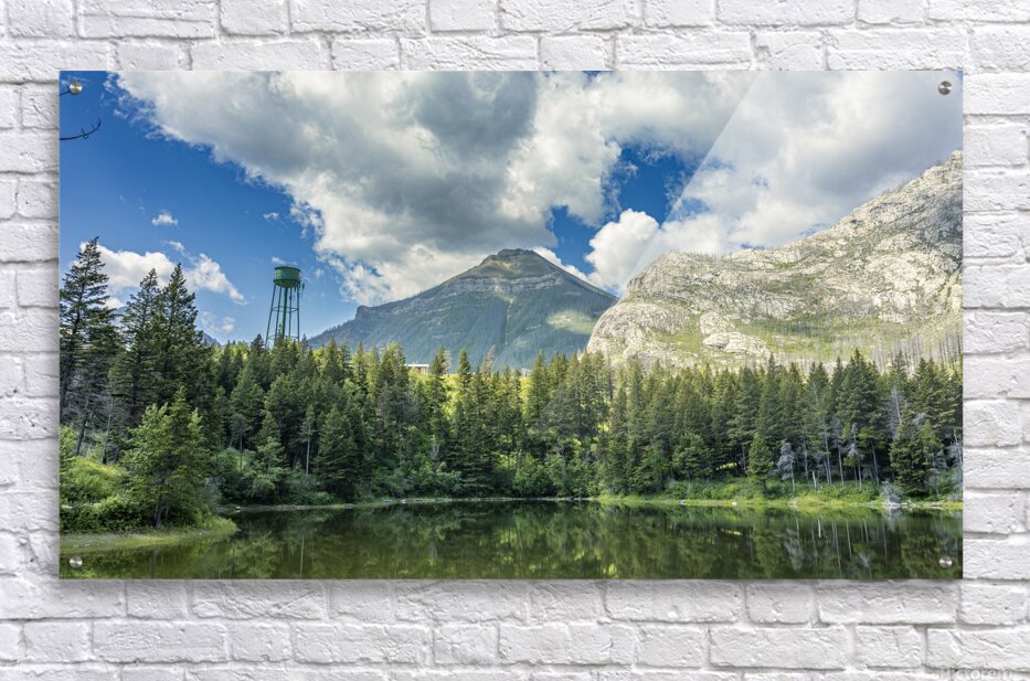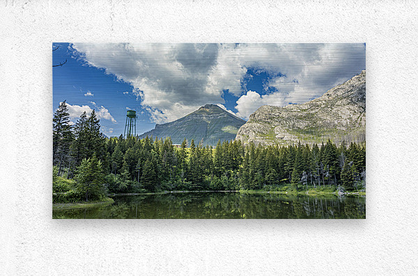 Reflections at Waterton presents a quiet scene near Waterton Lakes National Park, where towering mountains rise behind dense evergreen forest. A water tank stands subtly among the trees, adding an unexpected human element to the natural landscape. The still water mirrors the sky and surrounding greenery, emphasizing the calm atmosphere of this western Canadian setting. This piece offers a thoughtful addition to any space, inviting a moment of quiet reflection.