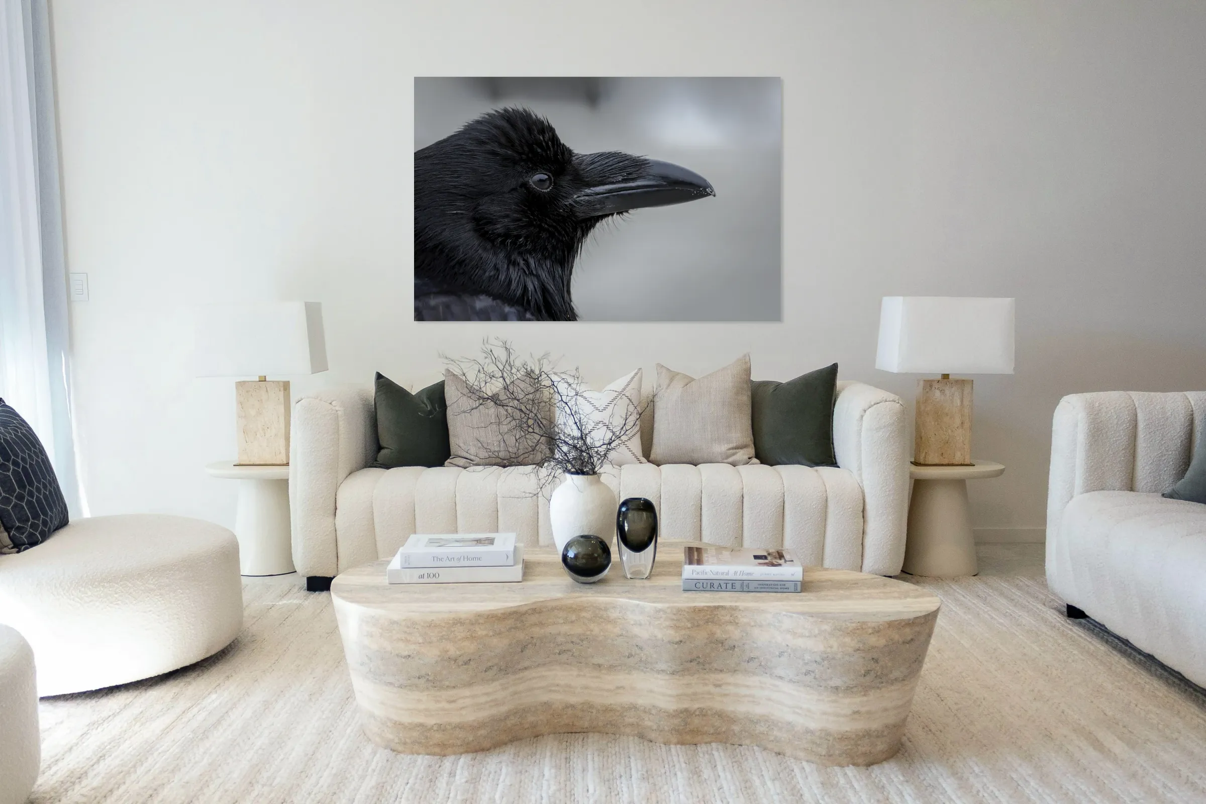 This close-up of a raven reveals the intricate textures of its feathers and the sharp curve of its beak against a muted backdrop. The image reflects the quiet resilience found in the natural world, a common sight across Manitoba’s diverse landscapes. A subtle study in detail and form, this piece offers a compelling addition to those who appreciate wildlife's understated presence. It’s a fitting element to bring a touch of the northern wilderness into your space.