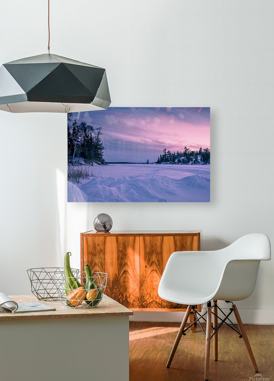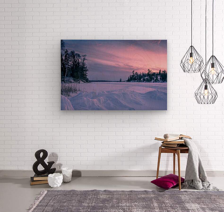 Frozen Lake at Dusk depicts a quiet winter evening at Manitoba Pioneer Camp on Shoal Lake, Ontario. A frozen expanse stretches beneath a soft pink-and-purple dusk; snow drifts line the shore while dark evergreens rise from rocky banks, revealing the subtle shift of light as day slips into evening. Available as a limited edition archival print, the photograph brings a calm, natural presence to a room — a quiet addition well suited to living rooms, offices, or cabin spaces.