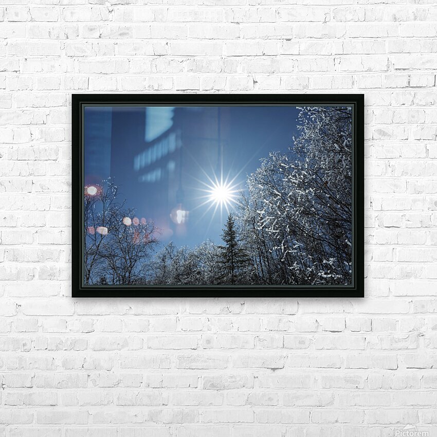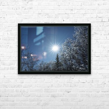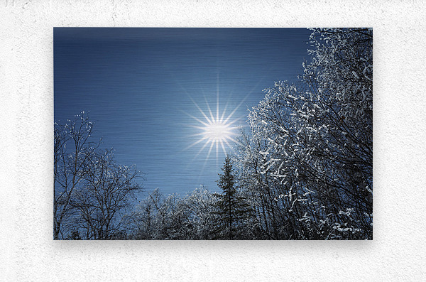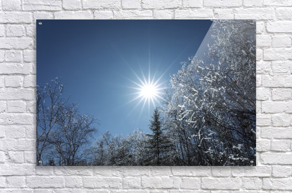 Winter Sunburst — A sharp sunburst radiates across a clear Manitoba sky above frost?covered trees. Captured on the Dragon Fire Trail by West Hawk Lake (Whiteshell Provincial Park), the icy branches glisten with lingering hoarfrost, revealing the quiet resilience of a winter day in the Whiteshell. The sun's geometric flare against deep blue contrasts with the crystalline canopy, presenting a calm, straightforward landscape. Available as a fine art print — a subtle, striking addition to your space.