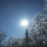 Winter Sunburst — A sharp sunburst radiates across a clear Manitoba sky above frost?covered trees. Captured on the Dragon Fire Trail by West Hawk La...[+]
