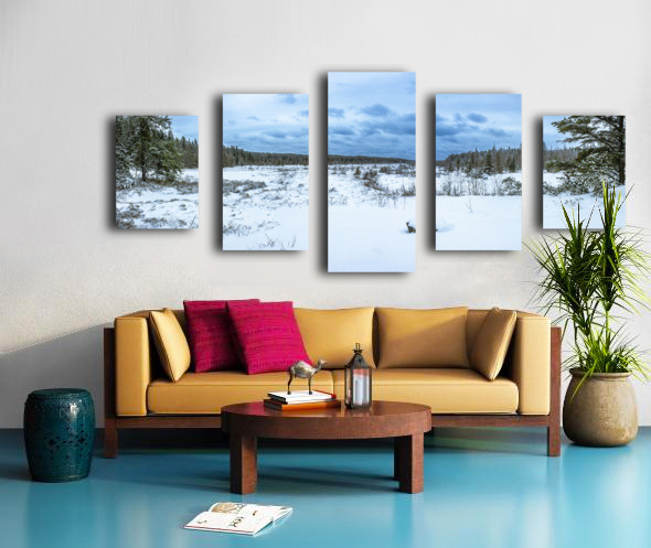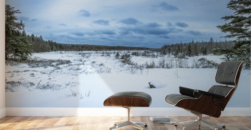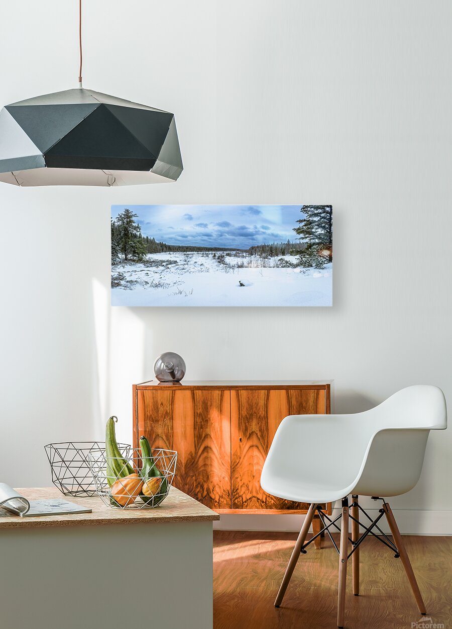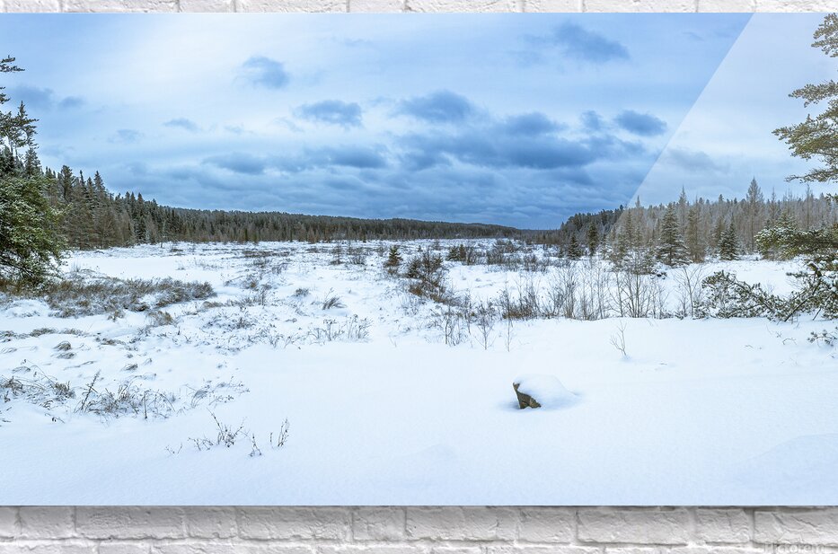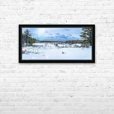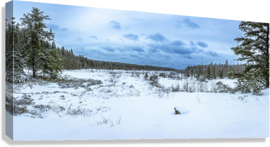 Winter Expanse — Captured on the Hanson Creek Trail in Whiteshell Provincial Park, this panoramic print presents a snow-covered expanse framed by de...[+]
