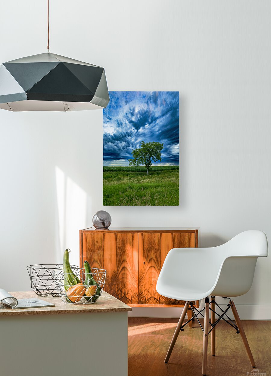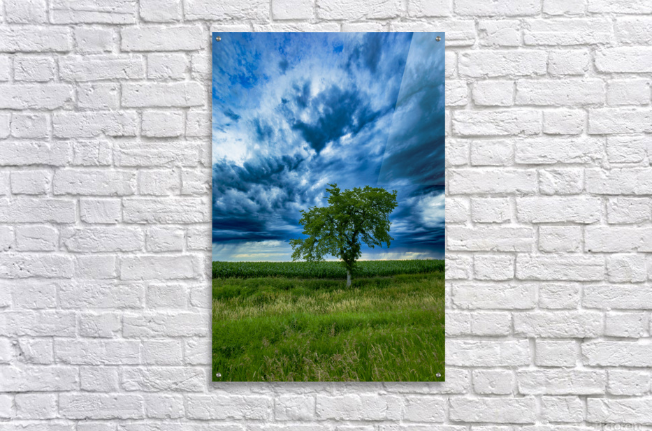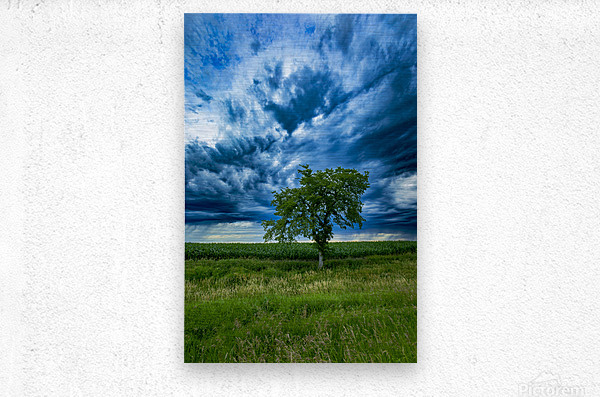 As I was driving back home in July of 2022 shortly after a rainstorm I was captivated by this cloud formation that while an optical illusion as there was no rotation, had the uncanny appearance of a hurricane, a brighter eye with what looks like rotating bands of clouds, I drove on the gravel road to find that lone tree standing in front of it and took my camera to take that stunning shot. I also love how you can see the rain fall by the horizon. One of my bestseller, taken in St-Pierre Jolys.