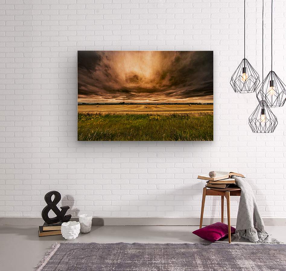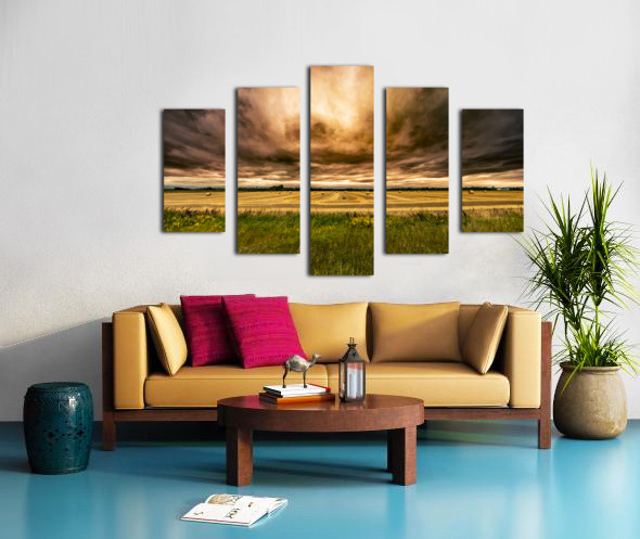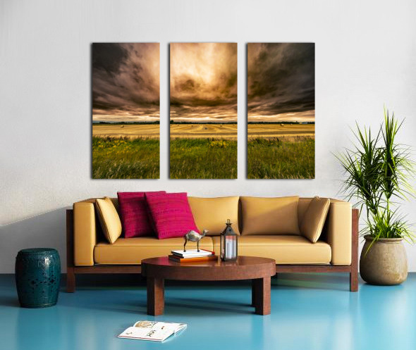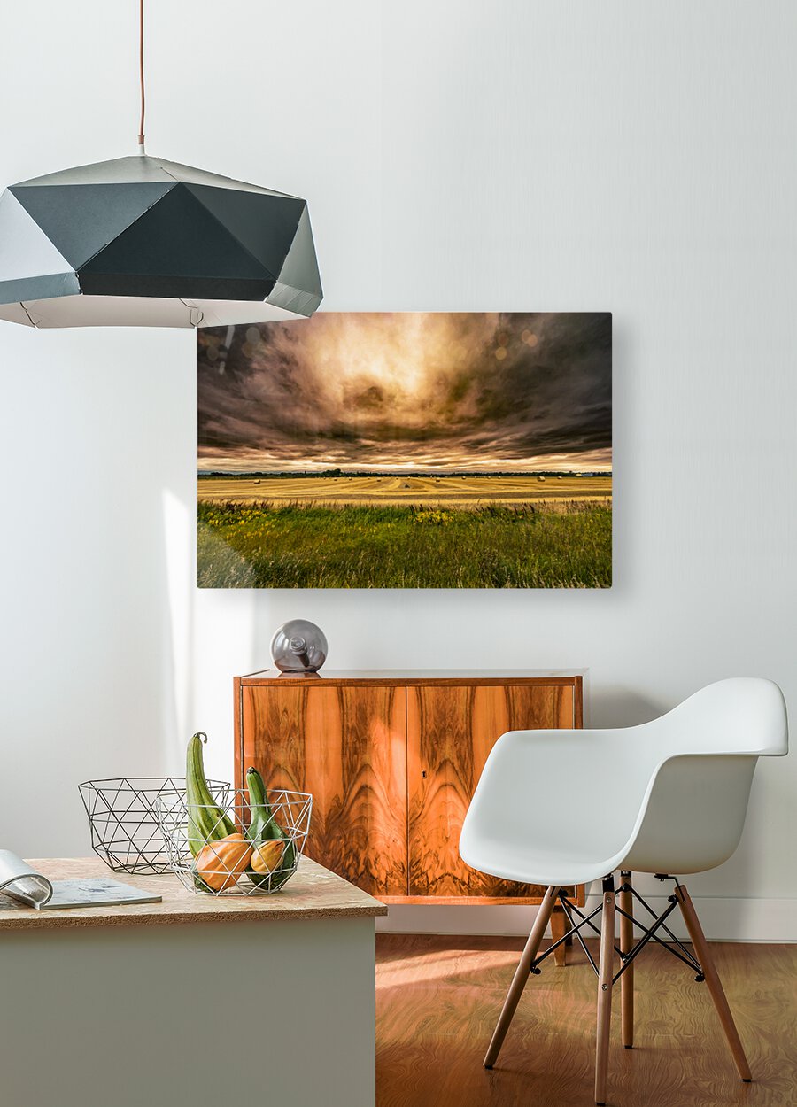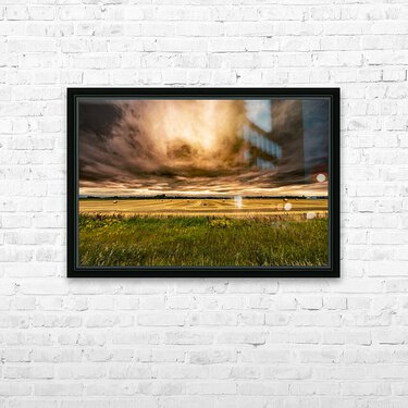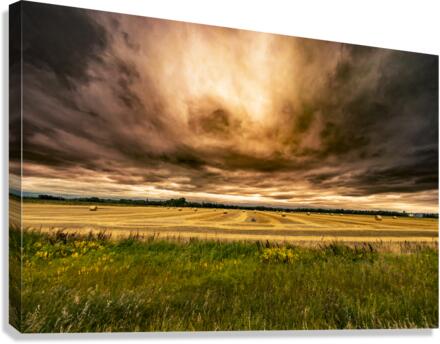 The cloud ceiling was very low on that harvest day near Otterburne, Manitoba and had a mixture of thick dark clouds and thinner ones which let the sun almost glow through it, one of the other interesting effect of harvest (at least for this picture) is that combining often unsettled a lot of dust from the fields which can often tint the sky a brown/orange well before the sun sets giving this photo a very surreal and almost menacing feel. It's been one of my best sellers!