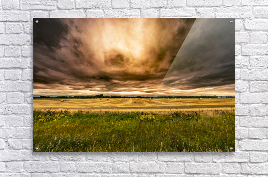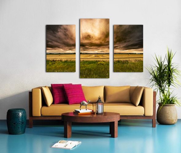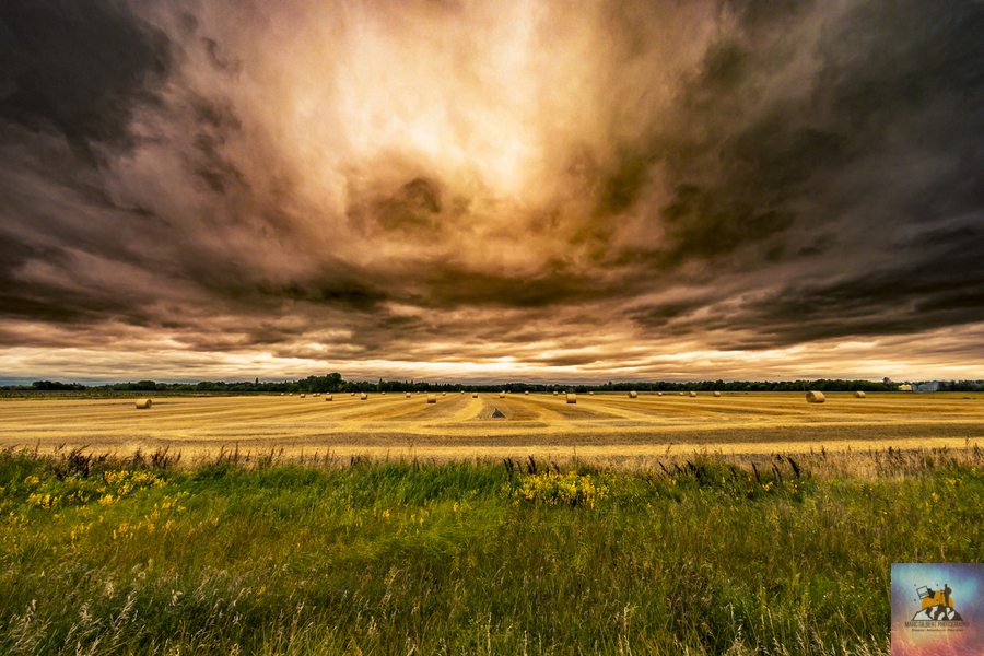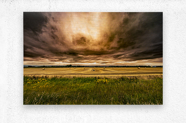 The cloud ceiling was very low on that harvest day near Otterburne, Manitoba and had a mixture of thick dark clouds and thinner ones which let the sun almost glow through it, one of the other interesting effect of harvest (at least for this picture) is that combining often unsettled a lot of dust from the fields which can often tint the sky a brown/orange well before the sun sets giving this photo a very surreal and almost menacing feel. It's been one of my best sellers!