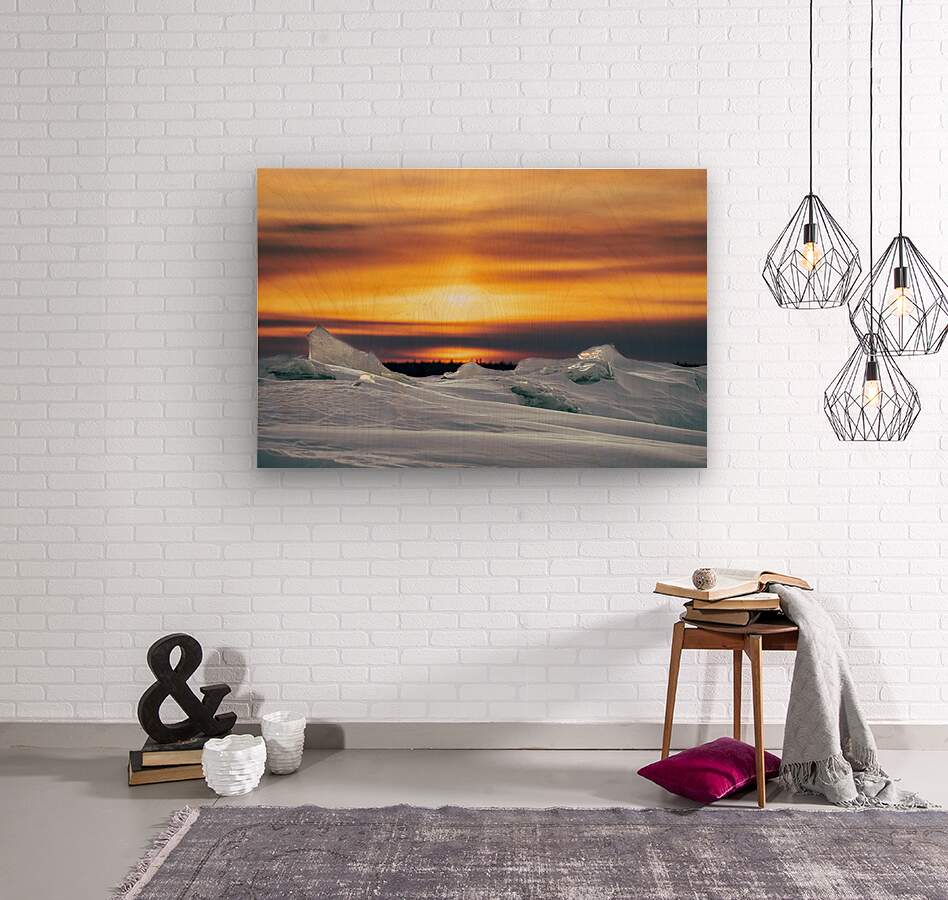 Sunrise behind an ice ridge on frozen Lake Winnipeg on Hecla island in March 2023