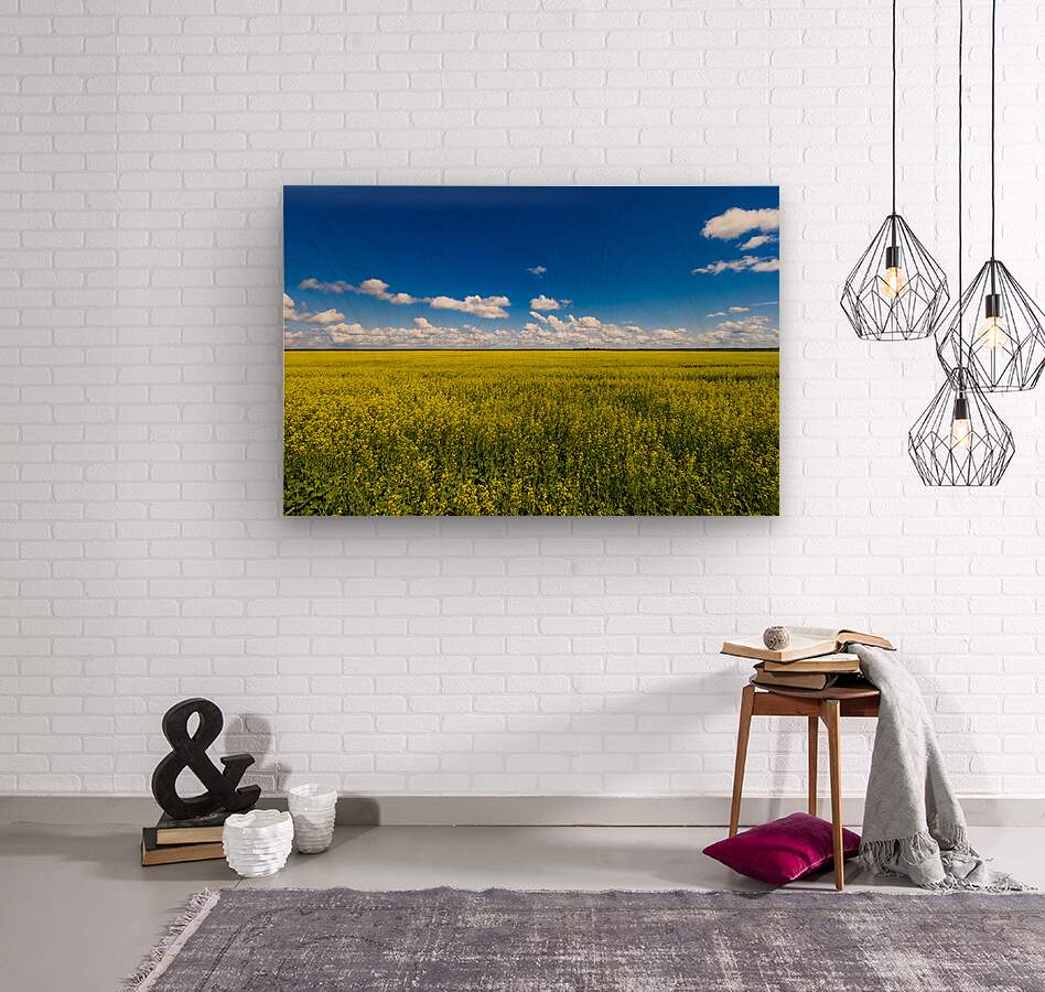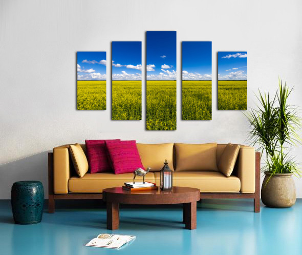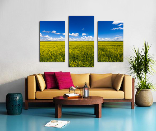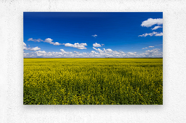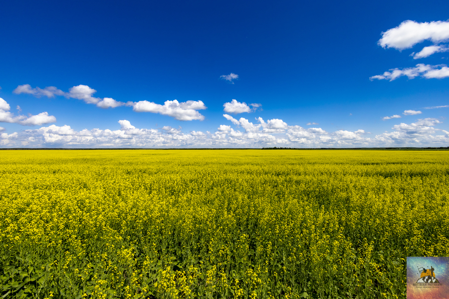 A canola field under a blue sky in rural Manitoba, taken in July 2022
