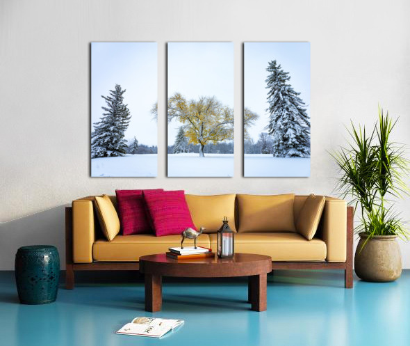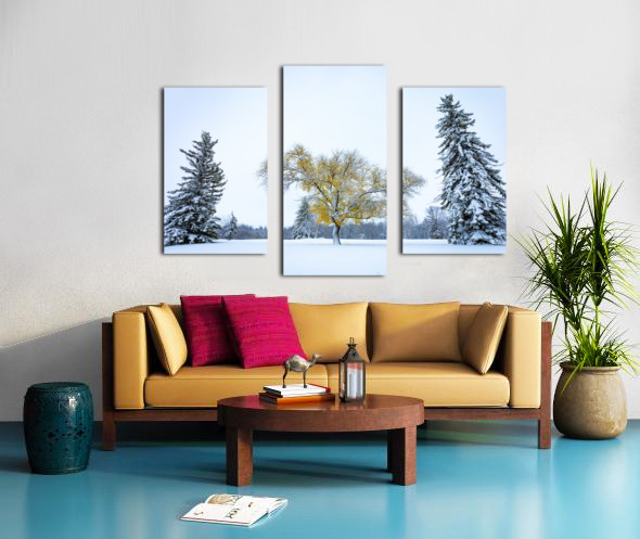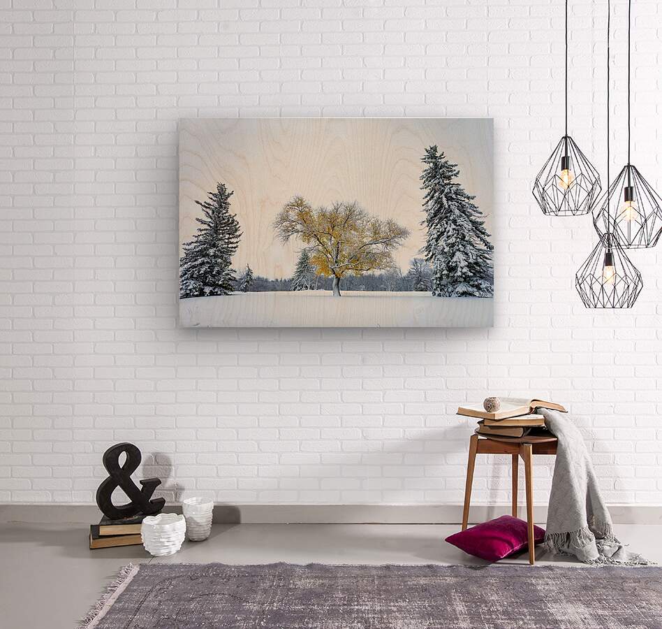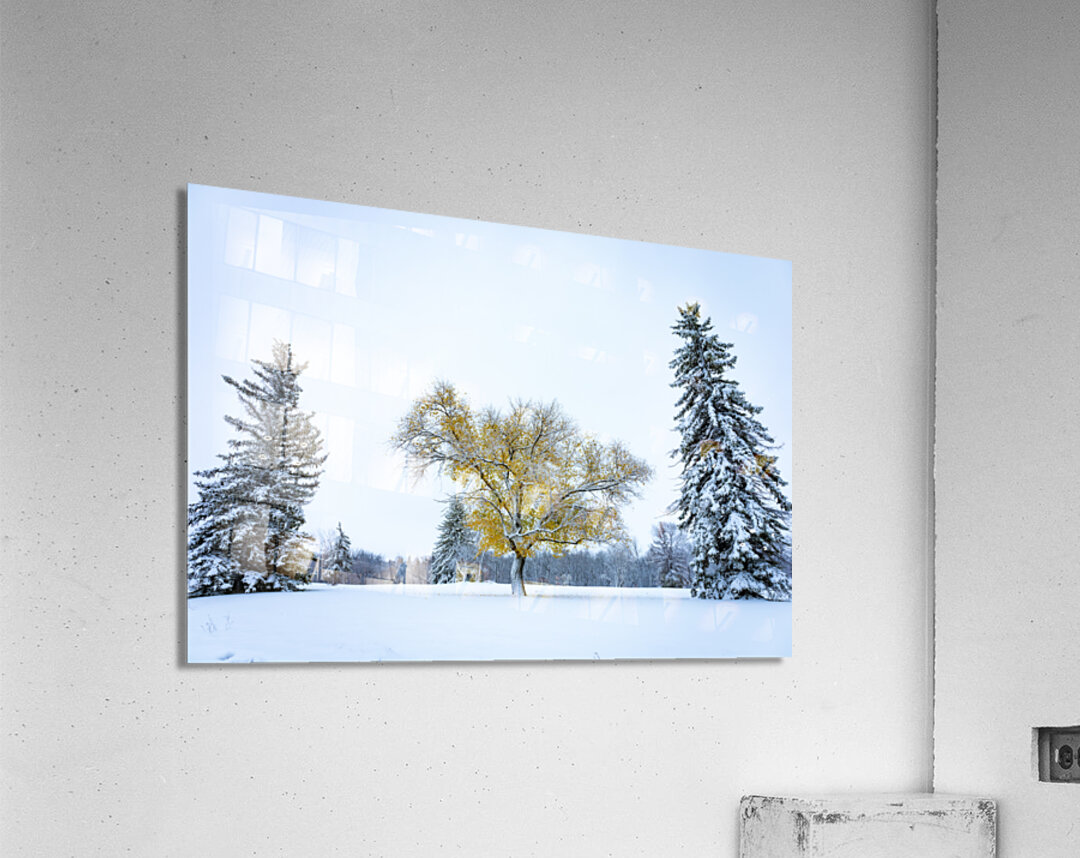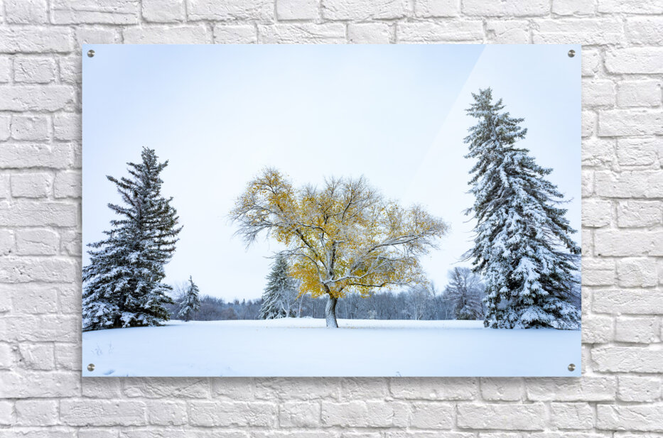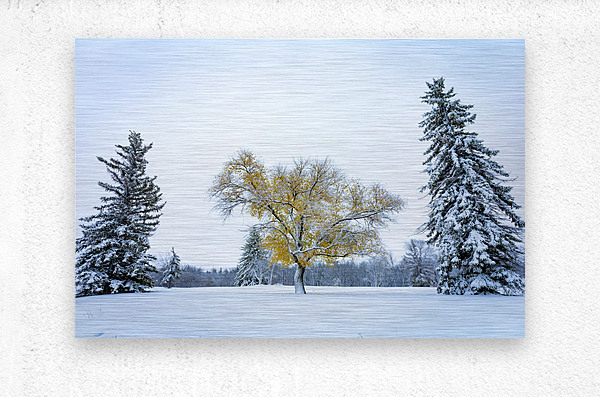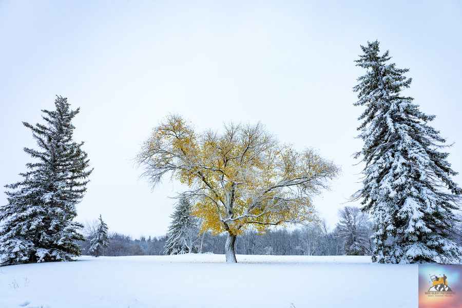 While we barely had any snow this winter, interestingly it came very early. In October, shortly before Halloween, we had our first snowfall here in Manitoba, the leaves were still hanging on some trees, creating a very unique scene, fearing that event would last too long, either the snow melting or the leaves falling, I jumped in my car in search of the perfect scene, I was greatly rewarded by this tree with yellow foliage standing between two evergreens.