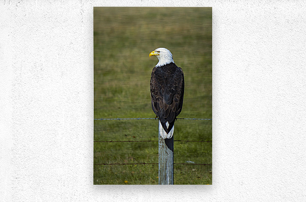 This striking image features a majestic bald eagle perched on a weathered fence post, embodying the spirit of wildlife in its natural habitat. Captured near Vita, Manitoba the eagle's sharp gaze and impressive plumage reveal the intricate details of its feathers, showcasing the beauty of nature. The soft, blurred background emphasizes the eagle's commanding presence, inviting viewers to appreciate the quiet strength found in these moments. This piece serves as a reminder of the remarkable wildlife that surrounds us and would make a thoughtful addition to any space, bringing a touch of the wild indoors.