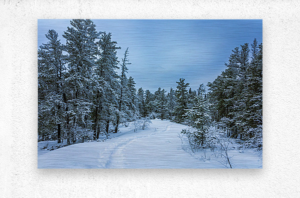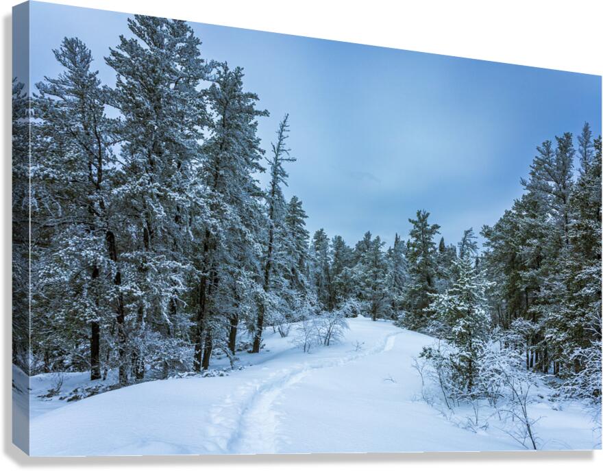 Winter on Hanson Creek Trail — photographed on Hanson Creek Trail in Whiteshell Provincial Park. This image portrays a quiet post?snow moment: fresh tracks carve a narrow path through deep snow beneath pines dusted in white, while a muted blue sky lends a cool, calm tone. The balance between open ground and tree line, and the lone trail leading into the woods, reveals the stillness that follows a snowfall. Limited edition archival prints are available — a quietly regional piece that would sit nicely in your living room, office, or cabin.