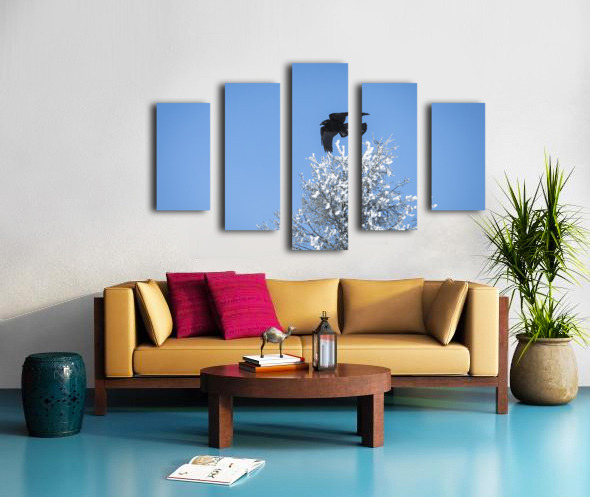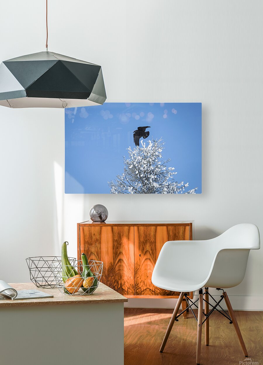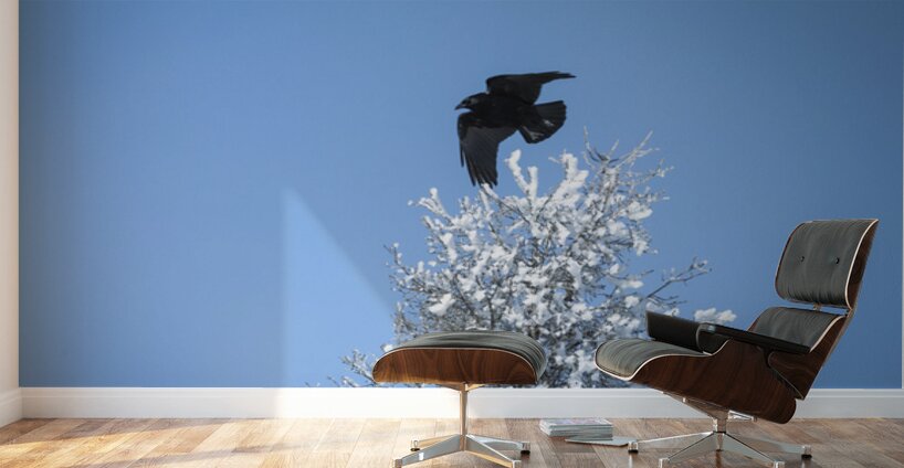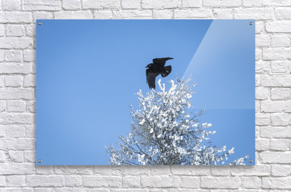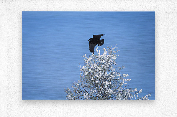 Winter Flight presents a solitary crow lifting off from the hoarfrost-laden branches of a tree against a clear blue Manitoba sky. The contrast between...[+]